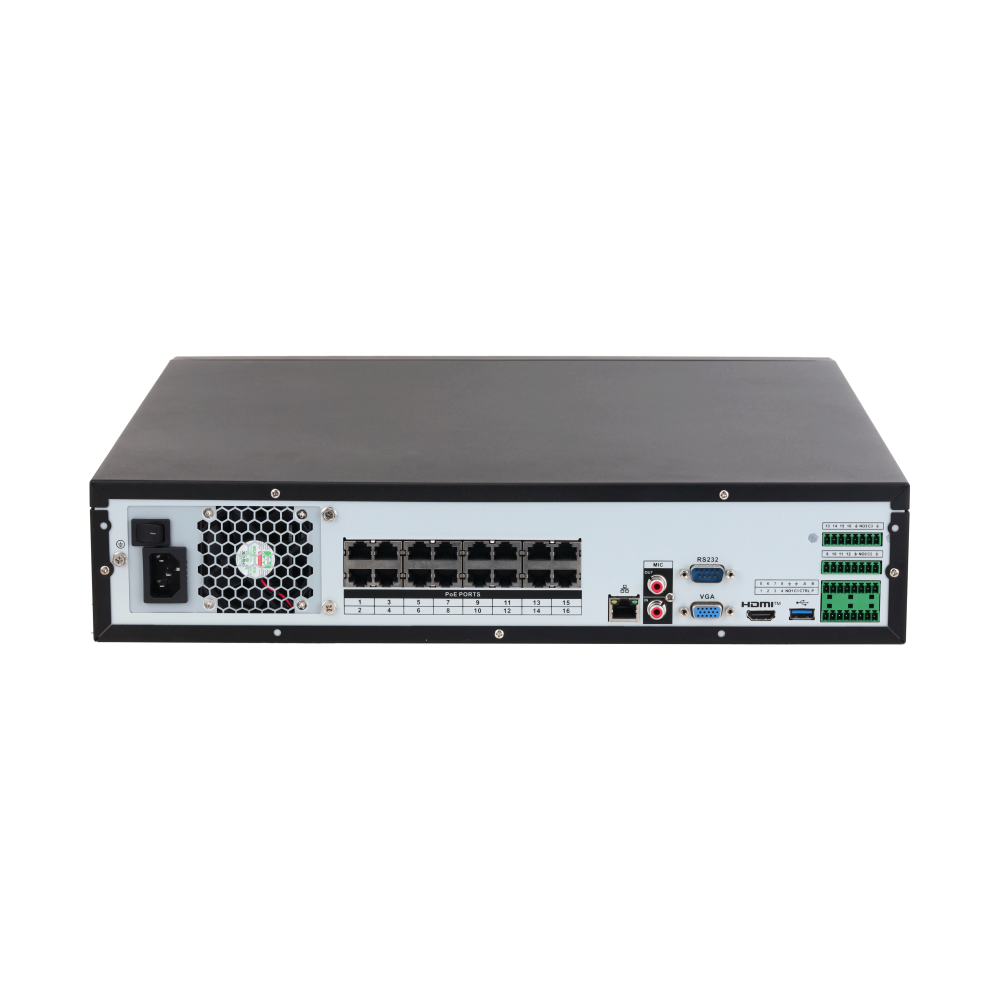 - Wbudowany 16 portowy switch PoE 150W – zapewnia łatwą instalację i zasilanie kamer IP bez potrzeby dodatkowych kabli zasilających.